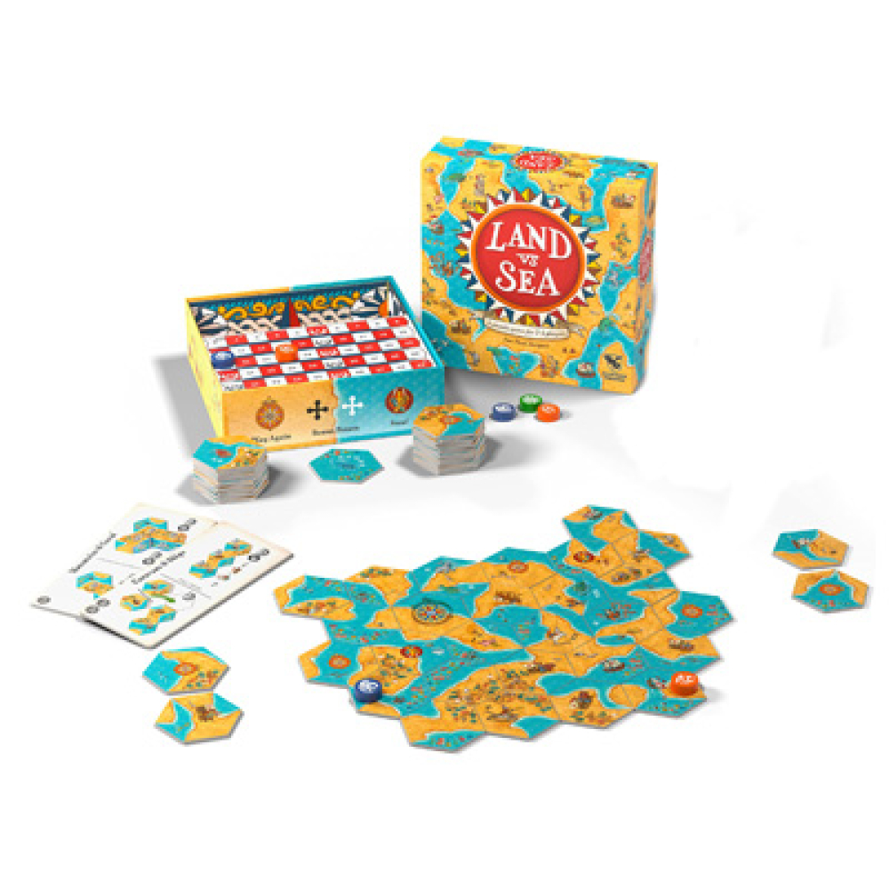 Part puzzle, part game. Play as either Land or Sea (or the Cartographer in a 3 player game). Each player plays with 2 double-sided hex tiles containing a mix of land and sea shapes. They take turns placing a tile each to make a map together. Land places tiles trying to complete land areas, and Sea places tiles trying to complete sea areas. Completed areas score a point per tile; land areas for Land, sea areas for Sea. Some tiles score bonus points for whoever completes the area they are in. So players may decide to strategically complete rival’s areas to gain their bonus points. Other tiles allow players to play their second tile, or steal a player’s tile - but not their last one!